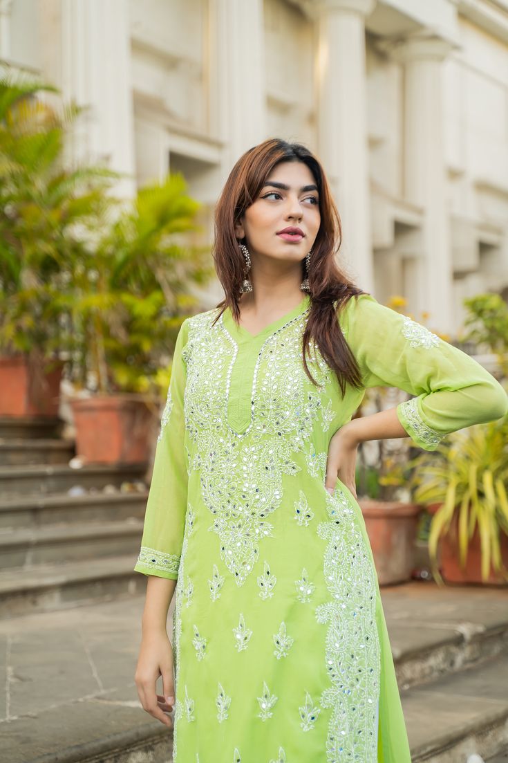 Lucknowi Chikankari kurtas have a charm and elegance that is unique to them. No other form of Indian hand embroidery has that. This delicately embroidered Long Kurti has intricate stitches of chikankari made on a frame by artisans. Usually kurtis like this one takes anywhere between 1 to 2 months to get ready out of which most time is consumed in the hand embroidery and hand printing process. If this is your first Chikankari kurti then be ready to fall in love with this heritage needlecraft and if it?s not your first then probably you?re already in love with the craft. Shop now and embrace the beauty of Nazrana?s heritage needlecraft, redefining sophistication with every product.